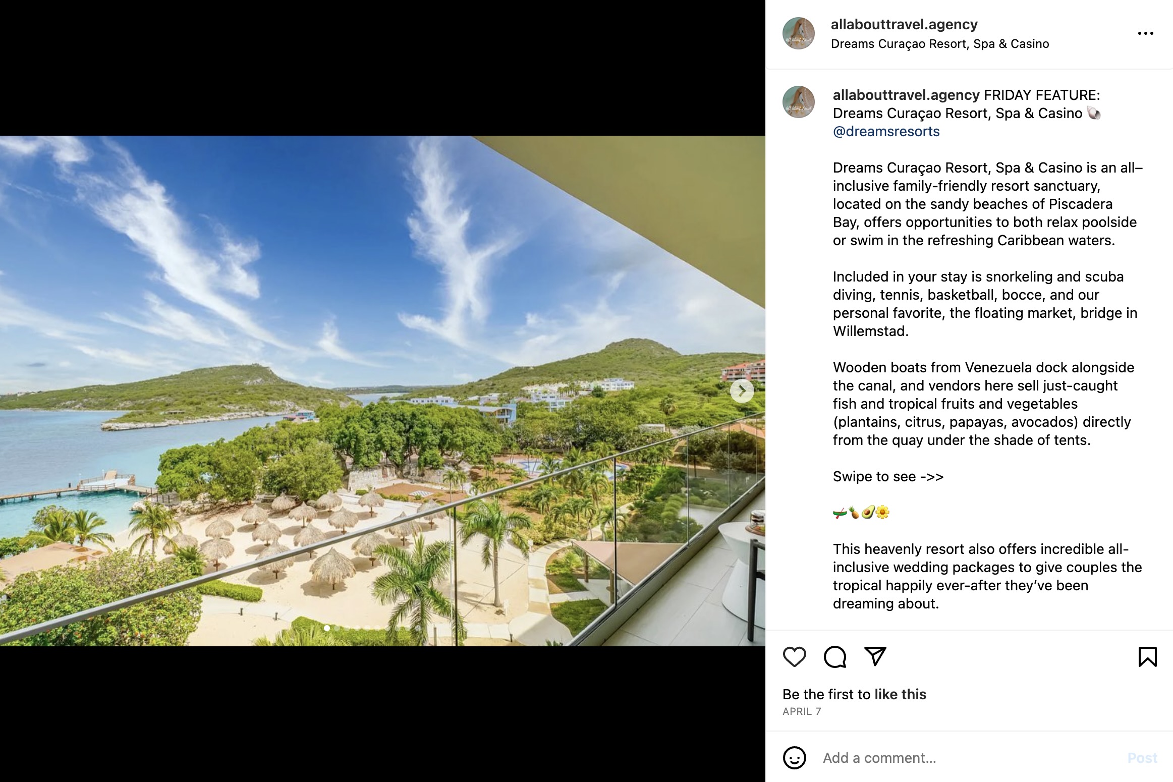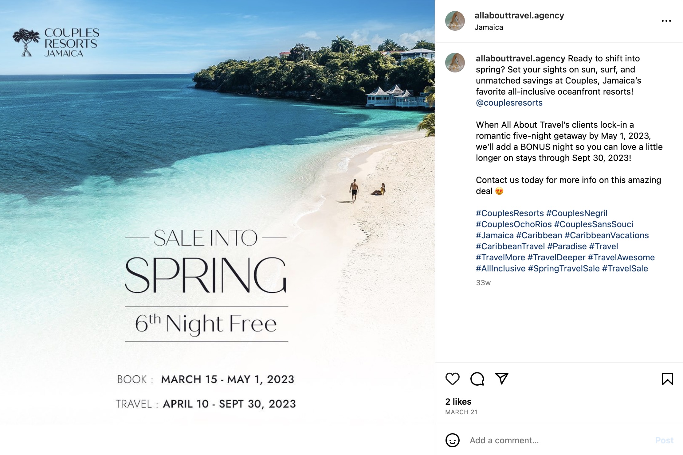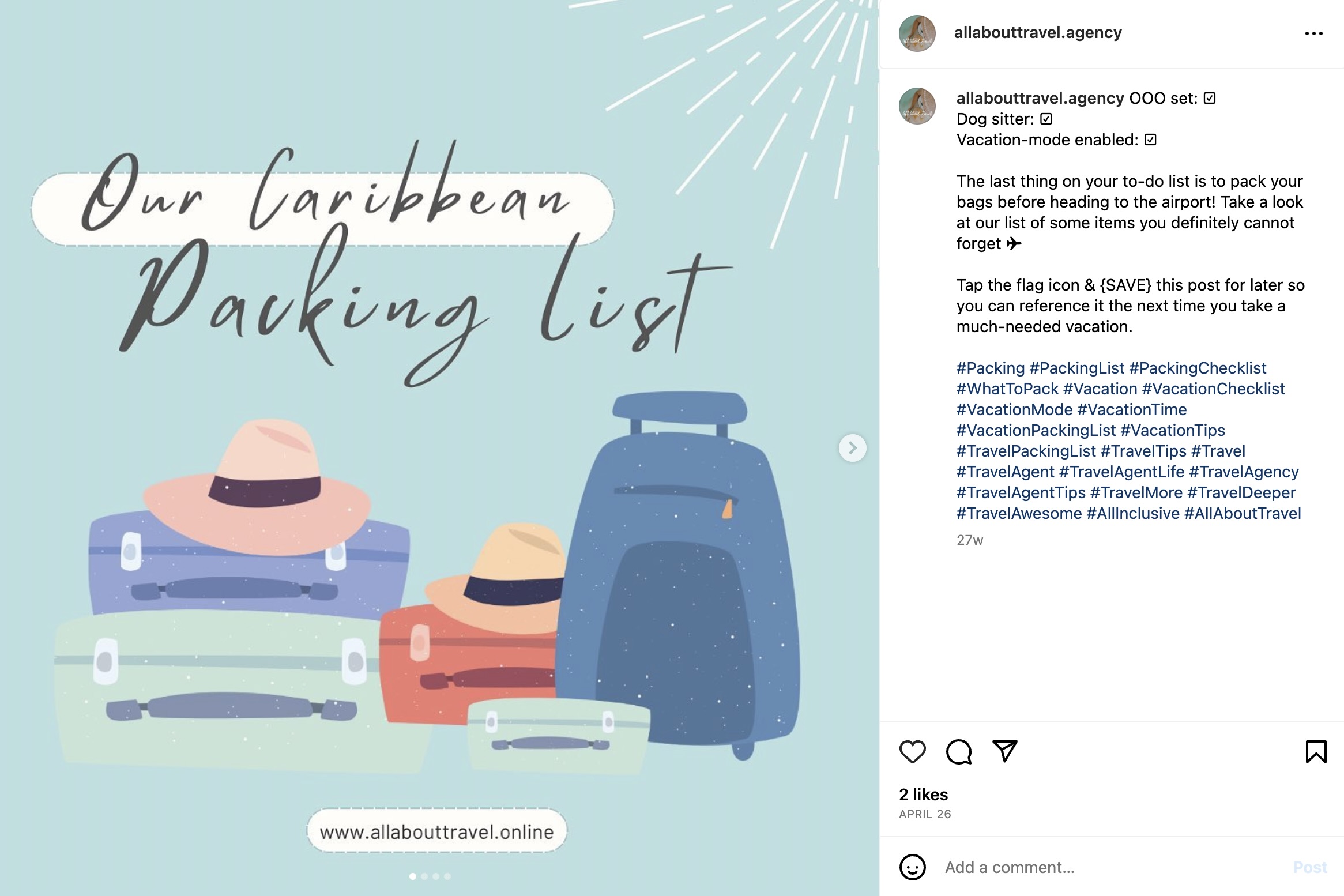 Solution: We created a visual appealing social account with engaging copy and researched hashtags to attract followers that are looking for all-inclusive vacations, mostly in the Caribbean. The account also offers travel tips for anyone who wants to plan their own trips.